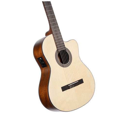 Los modelos AC de estilo tradicional se han rediseñado para mejorar la resonancia y lograr un auténtico sonido de guitarra clásica. La elegante combinación de maderas tonales produce un tono tradicional, profundo y deliciosamente suave. La serie AC de Cort es muy tolerante con los errores de los estudiantes, requiriendo un poco menos de precisión y agudeza para un buen sonido. La AC120CE, una guitarra clásica electrónica con cutaway, cuenta con tapa de abeto, fondo y aros de caoba, diapasón de laurel y cuerdas de cristal Savarez®.
