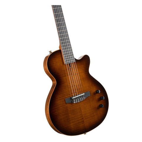 Una versión visualmente mejorada de la nueva Sunset Nylectric II, la DLX cuenta con ribetes de madera, tapa de abeto macizo con chapa de arce flameado en un lujoso acabado Tobacco Sunburst y herrajes dorados. Elegante e impactante a la vez, la Sunset Nylectric DLX ofrece una belleza estética que se complementa con su excelente facilidad de ejecución y características sonoras.